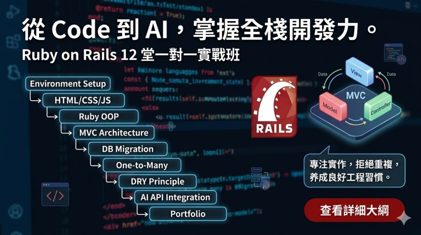本課程的重點並非死記某種語言的語法,而是幫助你建立「程式結構與理論」的堅實基礎——涵蓋 OOP(物件導向程式設計)、MVC 架構,以及 DRY(Don’t Repeat Yourself)原則。