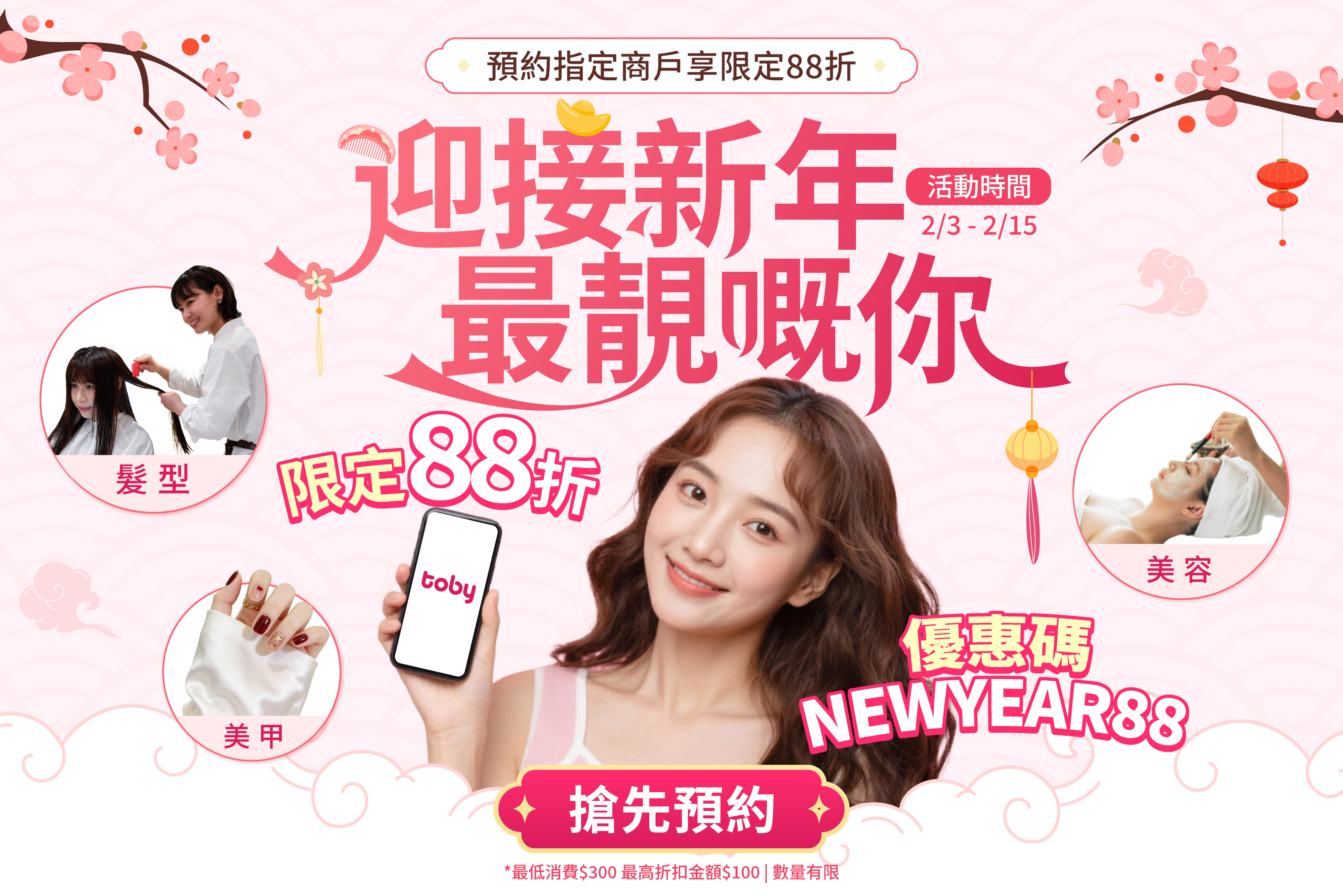 🧧新一年,迎接最靚嘅你!💇🏻♀️✨ 即日起至2月15日,經Toby預約指定商戶, 買滿$300 輸入優惠碼【NEWYEAR88】即享88折激減!