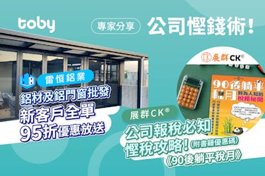 Toby 明白做生意不容易,除了每個月為帳目而頭痛,每年也要定期核數、報稅、交稅;如果要營運辦公室或實體商鋪,有時或需要裝修或維修,單是材料費已是一筆成本⋯⋯ Toby 今次分享公司慳錢術,包括提供專業稅務服務、公司成立、報稅及慳稅攻略的「展群稅務 CK TAX」,以及提供鋁材及鋁門窗批發價優惠的「雷恒鋁業有限公司」,為各位專家提供商家合作機會!想知道詳情就請細閱以下文章啦: