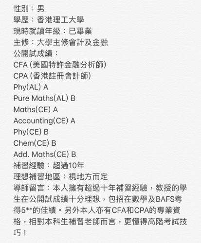 導師留言:本人擁有超過十年補習經驗,教授的學生在公開試成績十分理想,包招在數學及BAFS奪得5**的佳績。另外…