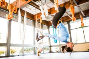空中瑜伽 運用懸吊嘅布帶或吊床,於半空中做瑜伽動作 。由於有布帶作承托,所以就算係筋骨僵硬嘅初學者,都可輕易做出各種於平地做唔到嘅伸展動作,而大量倒吊動作亦有助促進血液循環,紓緩脊椎問題。