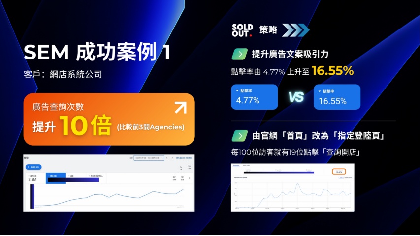 1️⃣【網店系統】廣告查詢量提升10 倍,轉換率高達19%。