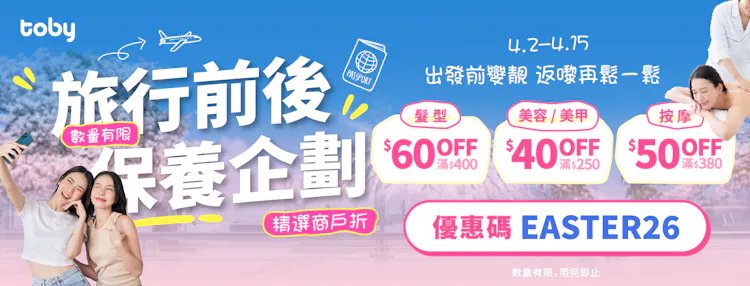 🌸 旅行前後保養企劃!預約指定商戶服務: 髮型 $60 OFF・美容 $40 OFF・按摩 $50 OFF ✨ (4.2-4.15)